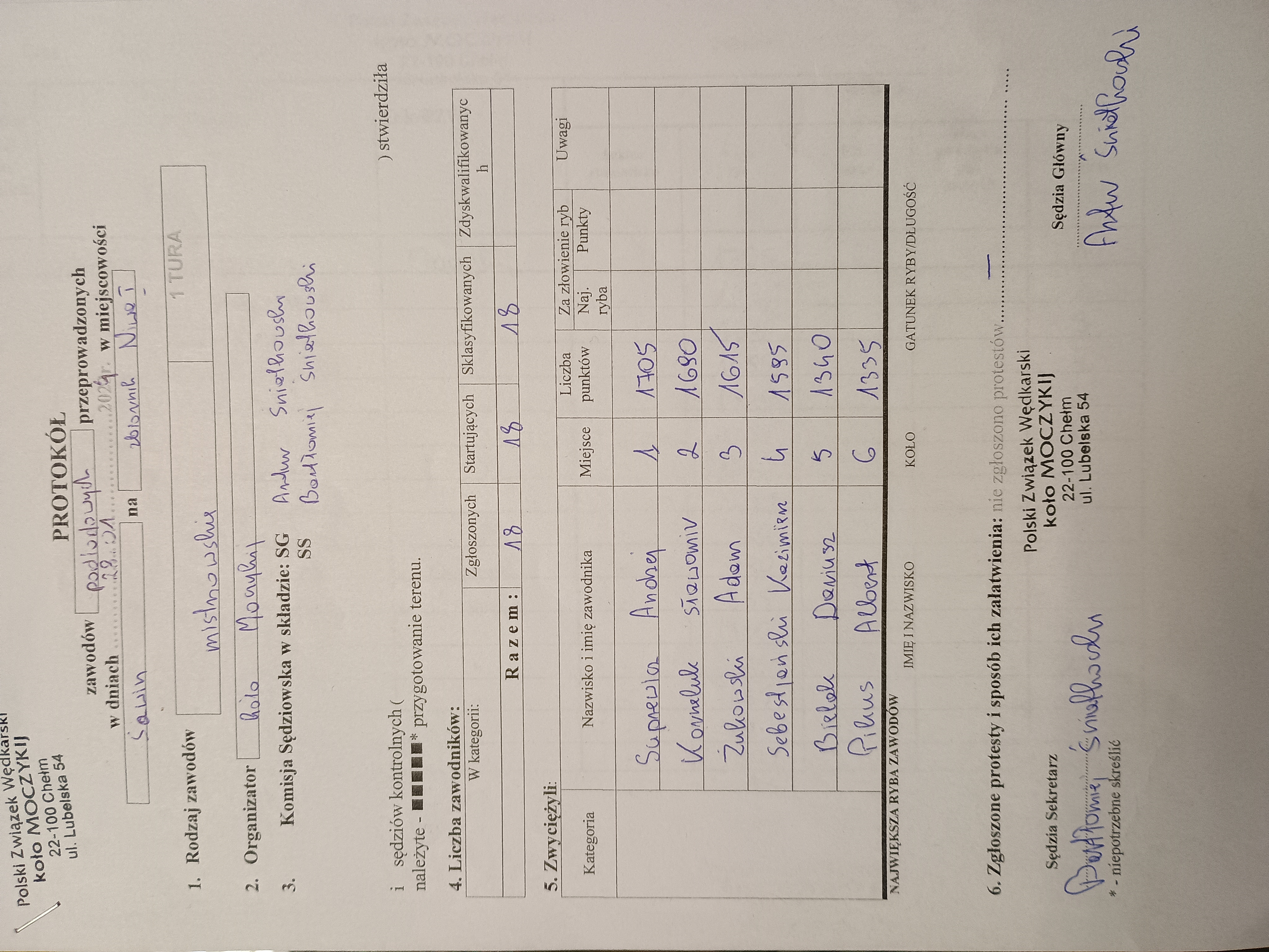 Koło Moczykij 28 stycznia 2024r. zorganizowało mistrzostwa podlodowe na zbiorniku Niwa 1 w Sawinie w których wystartowało 18 zawodników. Przy bezpiecznym lodzie i bardzo sprzyjającej pogodzie bez większych podmuchów wiatru i żadnych opadów wędkowanie okazało się dużą przyjemnością. Wszyscy zawodnicy nie narzekali na brania nawet laicy startujący pierwszy raz na lodzie. Przyłów to głównie płotki , ukleje i okonki, ale zdarzały się też przyzwoite okazy z których największy to 35cm okoń złowiony przez kol. Z. Matyszczuka. Startujący informowali również o potyczkach z większymi okoniami i leszczami , których nie udało się wyholować. Po 4,5 godzinnej rundzie sędziowie A.Śniatkowski i B.Śniatkowski przystąpili do ważenia, a wszystkie ryby wróciły bezpiecznie do wody. Po podsumowaniu wyników okazało się ,że mistrzem koła i zdobywcą pucharu został A.Suprewicz z wynikiem 1705g. Drugie miejsce zajął S.Korneluk z wynikiem 1690g i trzecie A.Żukowski 1615g. Pozostałe miejsca przedstawi tabela zał. Po zakończeniu zawodów wszyscy startujący posilili się gorącą kwaśnicą przygotowaną na miejscu w garnku węgierskim oraz grzańcem.Jeżeli w lutym dopisze ponownie pogoda planowane jest rozegranie towarzyskich zawodów podlodowych . Zachęcamy do śledzenia naszej strony oraz Facebooka koła Moczykij oraz przypominamy,że już w sprzedaży są znaczki oraz zezwolenia do wędkowania w sezonie wędkarskim 2024. Opłaty można dokonywać od poniedziałku do soboty w godz. 9-17 w sklepie wędkarskim Moczykij ul. Lubelska 54 Chełm. Wszelkie informacje dotyczące opłat można uzyskać pod numerem telefonu 783601600.